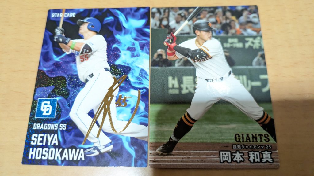 最近昔ほどプロ野球見ないので、2枚とも知っている選手で良かったわ。岡本を引き当てるとは。これは嬉しいね。大けがで離脱しているが。あの走者との接触はマジでヤバそうだなと思ってたら人体損傷の重症でしたな・・・。
